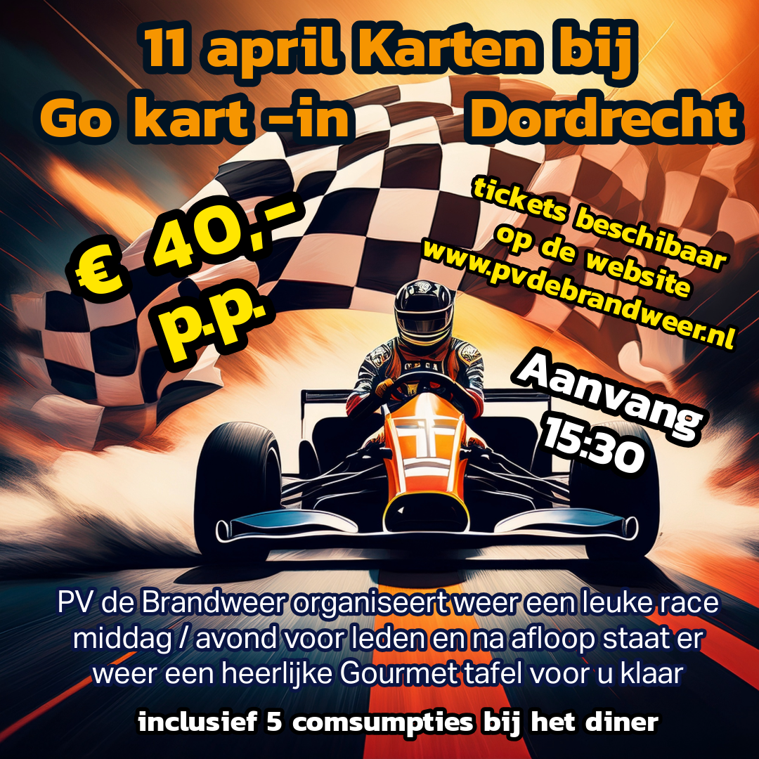 PV de Brandweer organiseert weer een gezellige middag en avond karten bij Go kart- in, Dordrecht. Arrangement bestaat uit instructie over de kart vrije trainingen, tijdtraining en als afsluiting de finalerace. Voor de winnaars uiteraard een hele mooie medaille. Daarna gezellig naar de tafelgrill voor nog een gezellige avond met elkaar